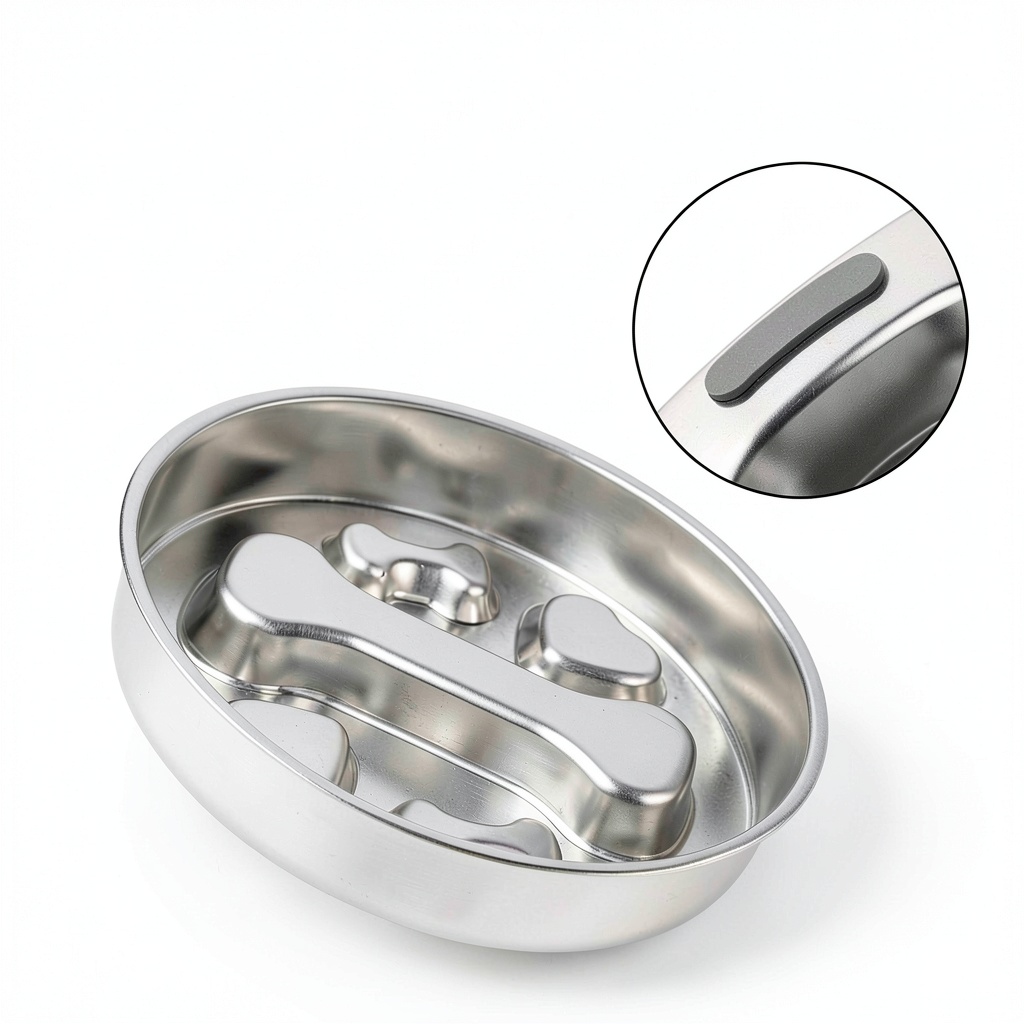 The Novery stainless steel slow feeder dog bowl combines durability and functionality for safer pet mealtimes. Crafted from food-grade stainless steel, it offers a sturdy alternative to plastic bowls, ensuring long-lasting use without harmful chemicals. Measuring 8.6 inches in diameter and 1.6 inches deep, it holds 2 cups of food, making it suitable for medium-sized dogs. The bowl features a raised bone-shaped ridge design that encourages slower eating, helping to prevent common issues like choking and bloating. With a rubberized non-slip base, it stays firmly in place even during active feeding sessions, and its dual-sided functionality allows for both meals and treat dispensing.