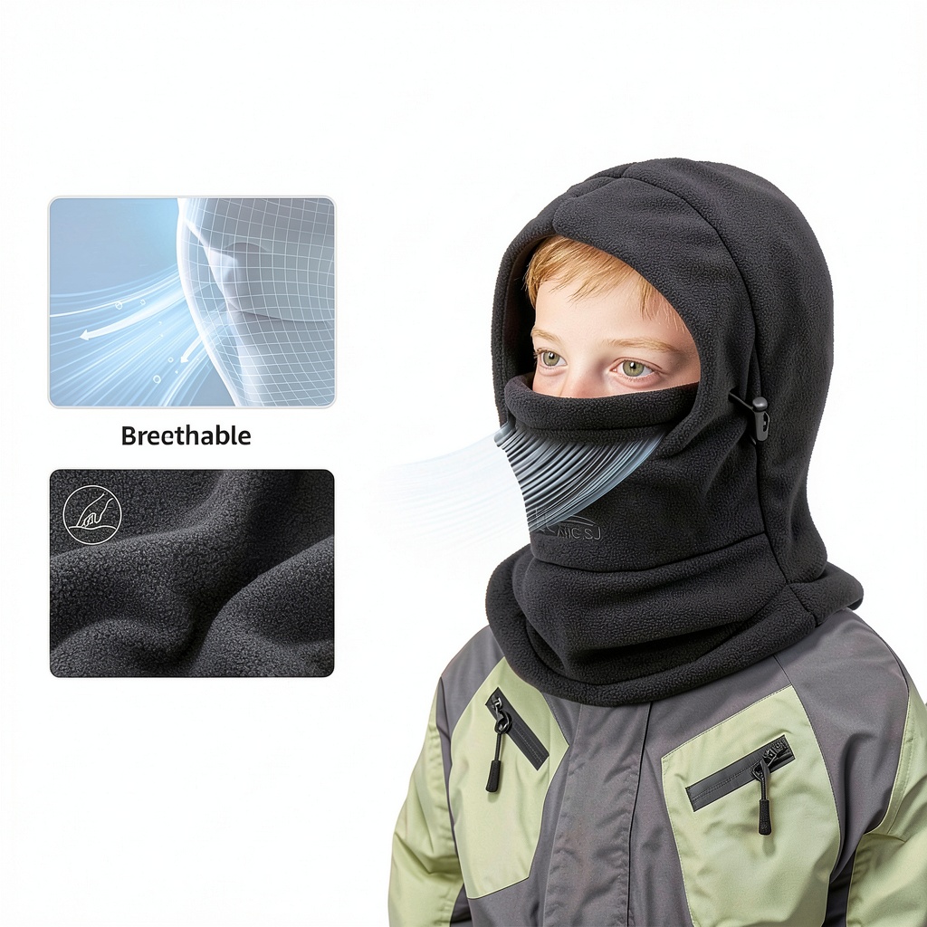 The balaclava features two side drawstrings that allow you to tighten or loosen the mask around the head and face, ensuring a snug fit that prevents cold air from entering and improves warmth retention.